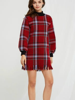 Robe courte et droite en laine mélangée rouge à motifs carreaux écossais et finitions frangées avec manches ballons et larges bords-côtes noirs élastiques de Storets