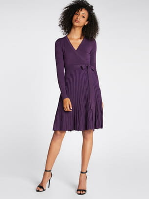 Robe plissée courte et fluide en maille métallisée violette à col V croisé et manches fuselées côtelées avec lient à nouer à la taille de Morgan