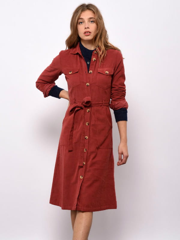 Robe-chemise ceinturée coupe midi en velours côtelé couleur rouille à col en pointe et multiples poches avec fermeture boutonnée façon corne de Leon & Harper