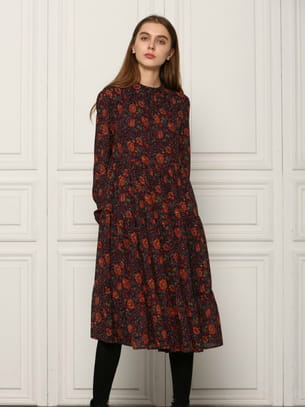 Robe midi ample à imprimé floral couleur bordeaux et rouille et encolure ronde ras du cou avec jeux de plis et poches passepoilées sur les côtés de See U Soon