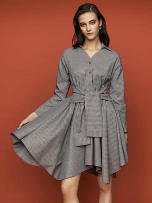 Robe-chemise courte et fluide avec imprimé pied de coq multicolores à col en pointe et haut boutonné façon corne avec effet manches à nouer à la taille et bas asymétrique de Maje