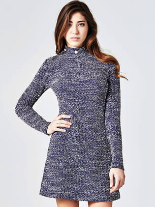 Robe courte moulante coupe patineuse en coton mélangé bleu et blanc à col montant perlé de Guess