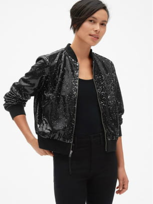 Veste style bomber courte et oversize en sequins noirs avec bords-côtes côtelés élastiques et fermeture zippée argentée de Gap
