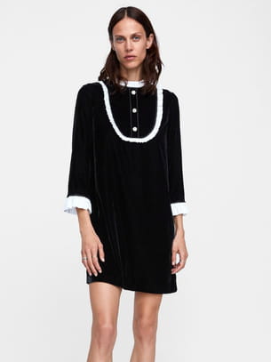 Robe courte et droite en velours lisse noir à manches trois-quarts avec boutons bijoux et empiècements blancs volantés de Zara