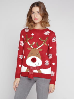 Pull court et droit en maille rouge à encolure ronde et bords-côtes côtelés avec motif renne et détails pailletés et pompons en reliefs de Cache Cache