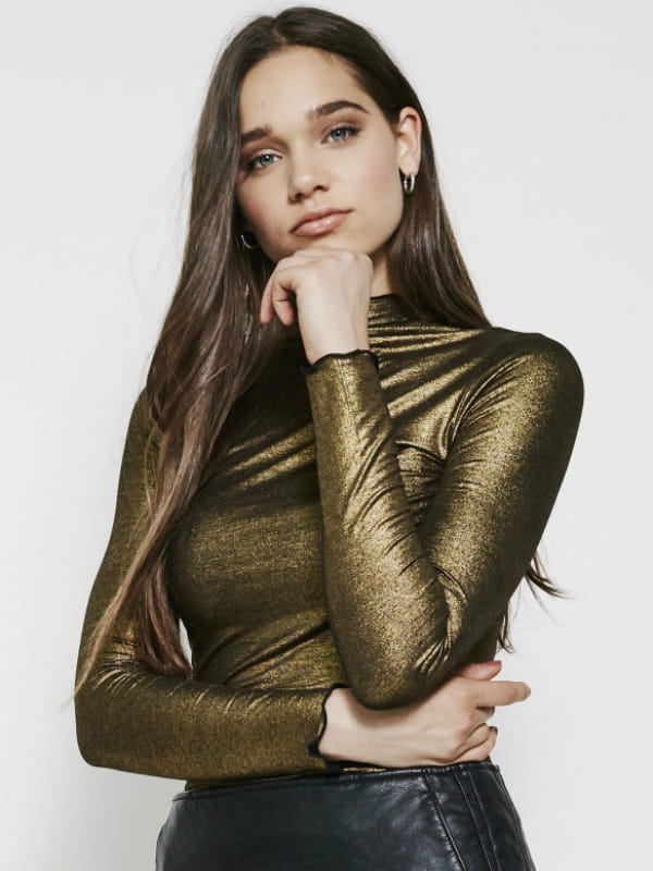 Top moulant à manches longues couleur or lamé à col montant et bords-côtes contrastants noirs d'Elevenparis