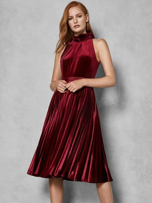 Robe plissée à coupe cintrée mi-longue en velours lisse couleur rouge sang avec col montant légèrement plissé et noué de Ted Baker