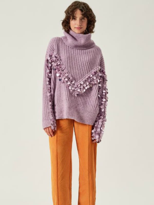 Pull oversize en laine mélangée et texturée couleur parme à col roulé et larges bords-côtes côtelés avec détails sequins brodés ton sur ton de Manoush