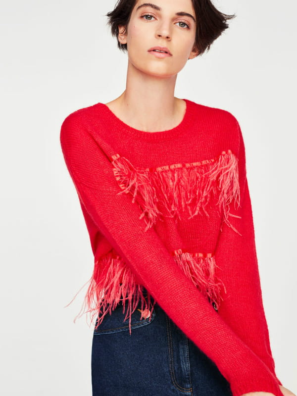 Pull court et oversize en maille rouge à col rond et emmanchures tombantes avec détails plumes inspiration autruche et bords-côtes côtelés d'Uterqüe