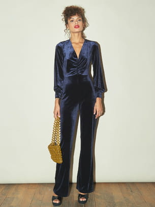 Combinaison pantalon fluide en velours lisse couleur marine à col V et manches ballons avec détails plissés et poignets resserrés de Rouje
