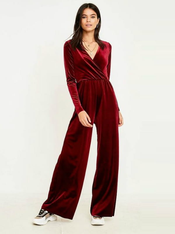 Combinaison pantalon en velours lisse couleur bordeaux à encolure V cache-cœur et bas évasé avec élastique à la taille d'Urban Outfitters