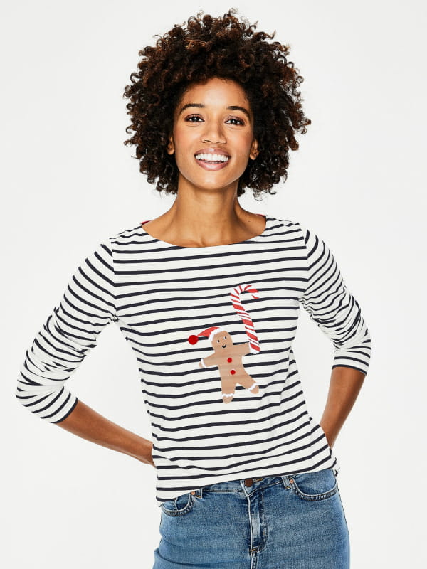 Top semi-ajusté en coton blanc et fines rayures horizontales couleur marine à encolure ronde et imprimé pain d'épice avec manches longues de Boden