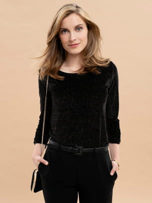 Top en velours lisse noir à large encolure ronde et manches trois-quarts avec pois pailletés argentés d'Un Jour Ailleurs