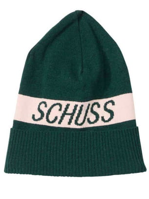 Bonnet en laine et cachemire couleur vert sapin avec motif color-block couleur crème à inscription "SCHUSS" et larges revers côtelés de Damart