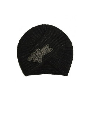 Bonnet en maille noire à détails entrelacés sur le devant avec fils scintillants argentés et fleurs brodées à strass de Naf Naf