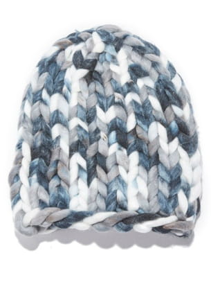 Bonnet en grosse maille tricotée avec camaïeux bleus et bord-côte tressé de La Redoute