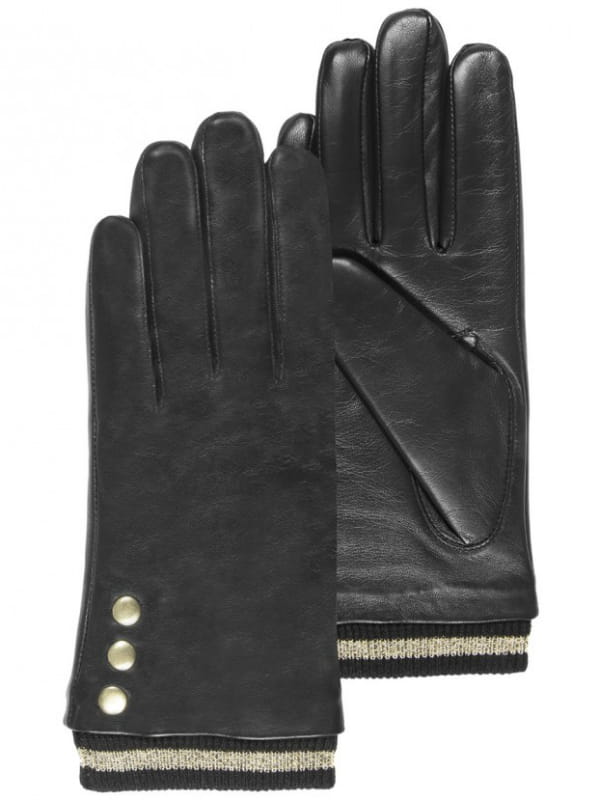 Paire de gants en cuir d'agneau noir avec bords-côtes en jersey côtelé extensible aux détails scintillants dorés et boutons-pressions dorés d'Isotoner