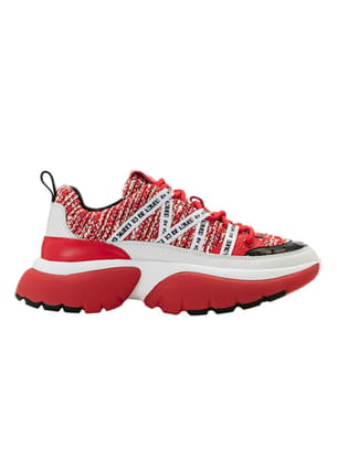 Basket type dad shoes avec semelle rouge et blanche et écriture sur le côté du pied de Maje
