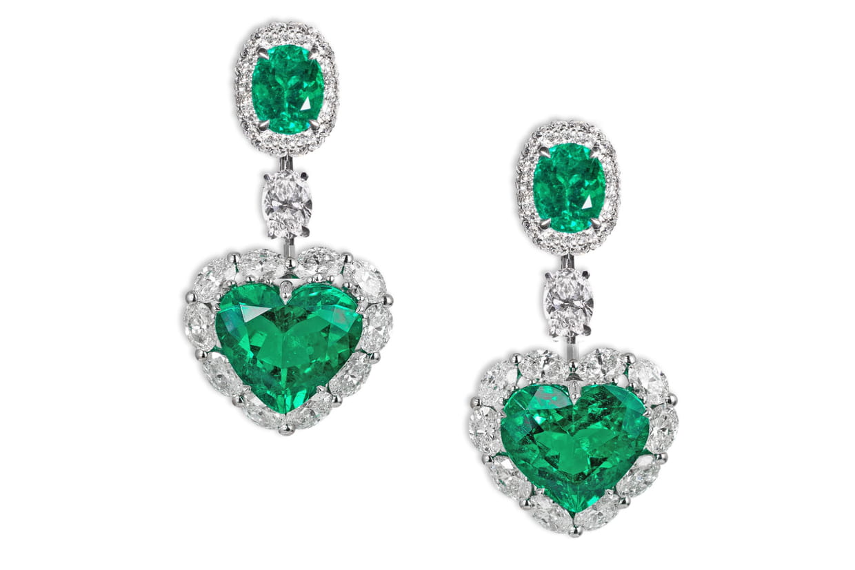 Boucles d'oreilles en or blanc, diamants et émeraudes de David Morris