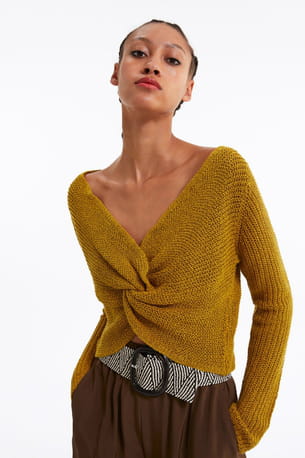 Pull moutarde en maille avec noeud sur le devant de Zara