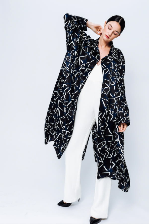Veste longue noire avec imprimés blancs abstraits de Carolina Ritzler