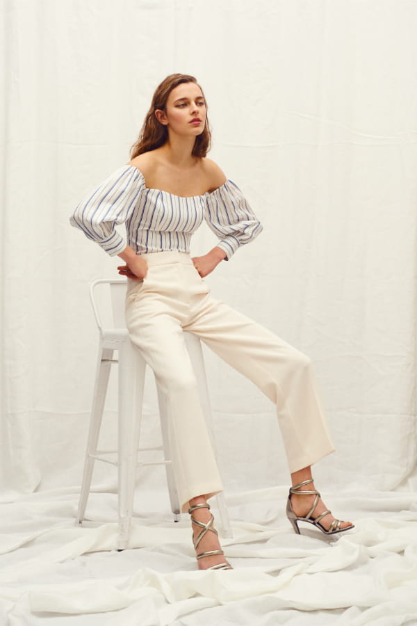 Jean blanc légèrement évasé et top tombant sur les épaules rayé de Claudie Pierlot