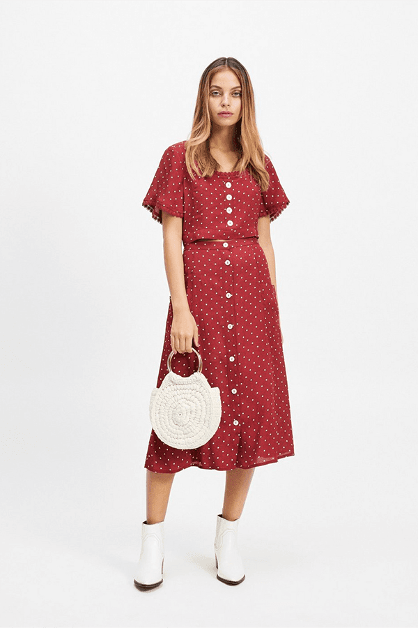 Jupe longue à pois bordeaux de Miss Selfridge