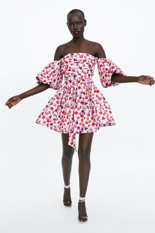 Robe imprimée avec ceinture plis sur le devant et manches élastiques bouffantes de Zara