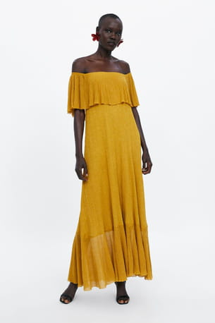 Robe longue à volants moutarde avec décolleté sur les épaules de Zara