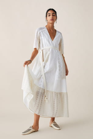 Robe longue avec coupe évasée, décolleté et manches courtes. Ceinture ton sur ton et broderies appliquées de Zara