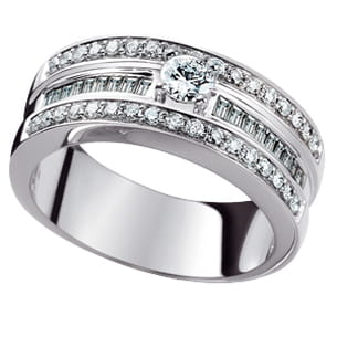 Romantique et intemporelle, cette bague en or blanc met en scène des diamants brillants associés à des diamants baguette de parts et d'autres de la pierre centrale.