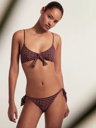 Maillot de bain deux-pièces terracotta et noir à petits carreaux vichy avec haut triangle avec nœud décoratif sur le devant et culotte nouée sur les côté de Mango