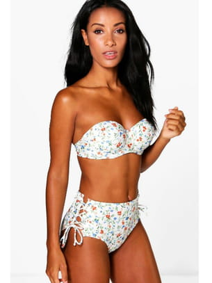 Maillot de bain deux-pièces blanc à fleurs rouges et bleues avec haut bandeau à coques et armatures et culotte taille haute lacée sur les cotés de Boohoo