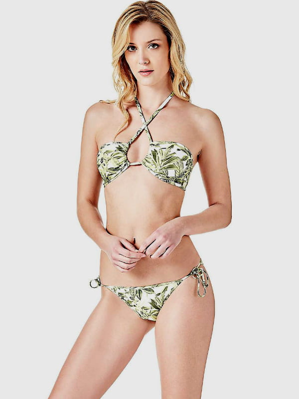 Maillot de bain deux-pièces blanc à imprimé feuillage tropical vert avec haut bandeau ouvert sur le devant et noué cou et culotte nouée sur les côtés de Guess