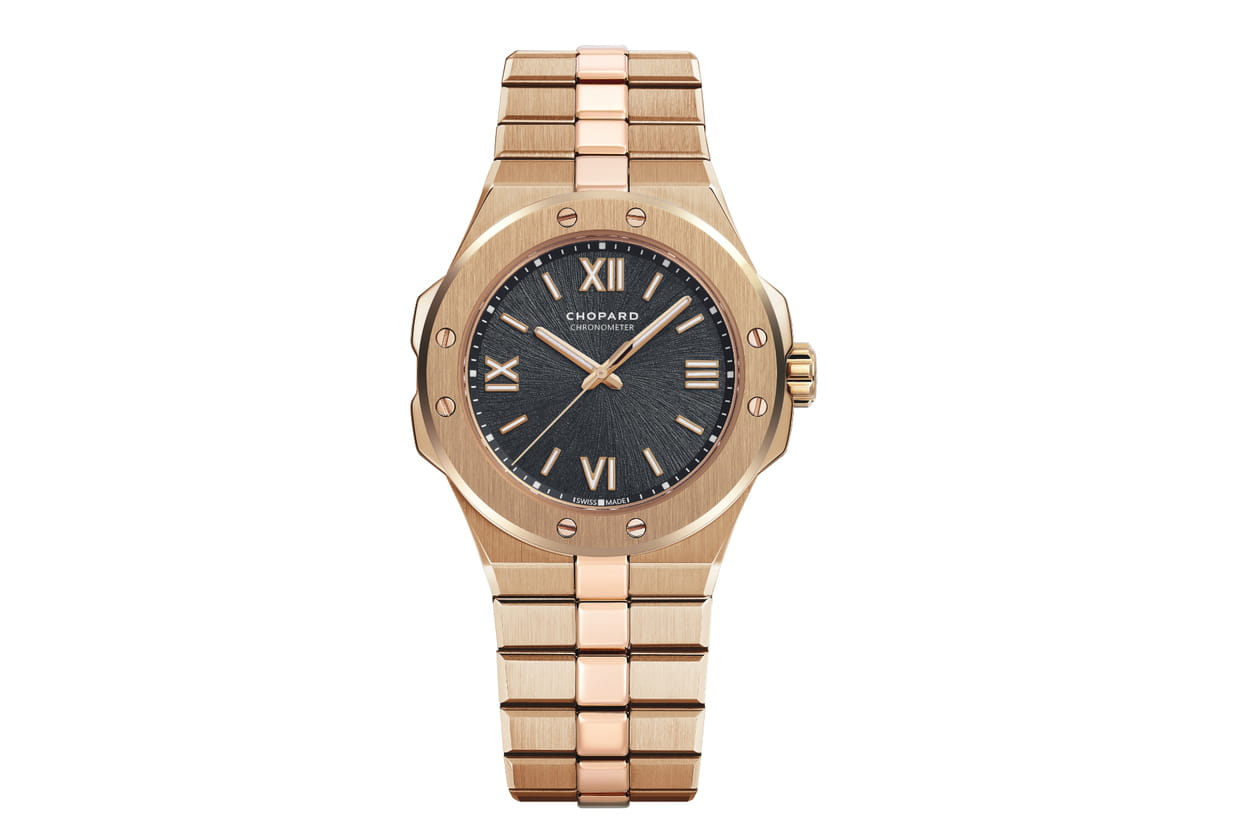 Montre boîtier 36 mm en or rose éthique et cadran en laiton galvanisé gris, mouvement mécanique à remontage automatique, bracelet en or rose éthique de Chopard
