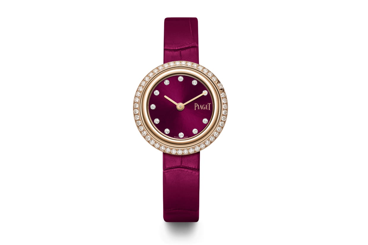 Montre en or rose, boîtier 29 mm serti de 42 diamants, mouvement à quartz et bracelet en alligator de Piaget