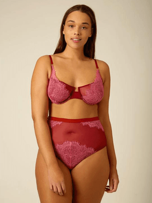 Soutien-gorge et culotte taille haute en dentelle rouge et rose de Dora Larsen