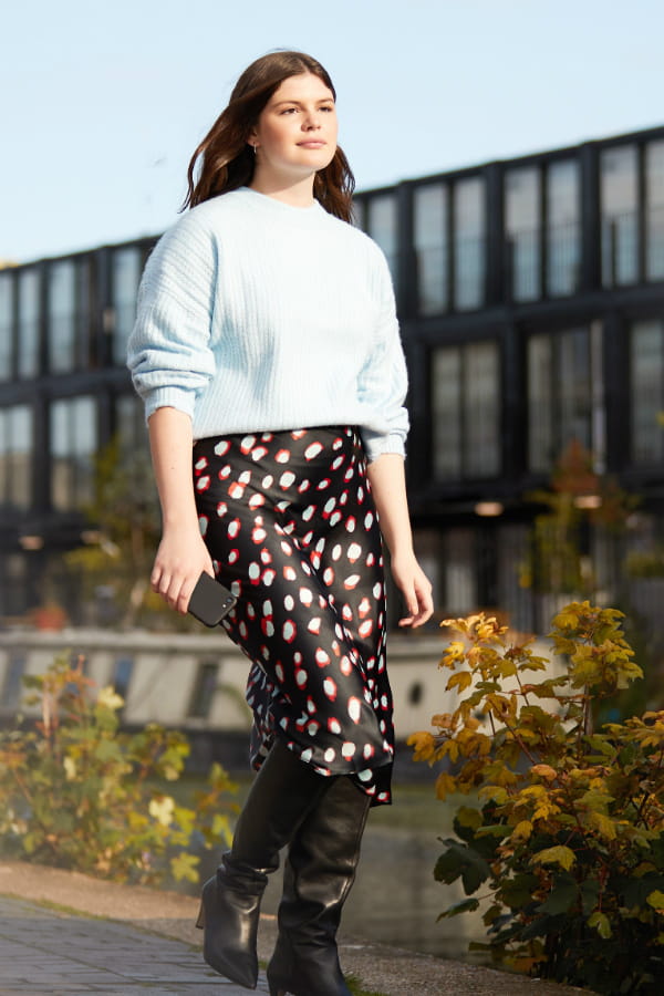 Jupe midi trapèze avec pois sur satin de Find sur Amazon fashion