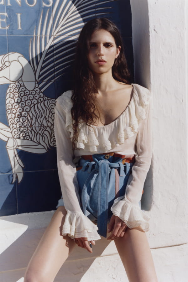 Short en denim de coton finitions patchwork en croute de cuir de Sessun