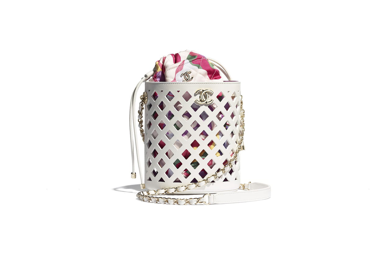 Sac à main à fermeture cordon en veau blanc ajouré et tissu imprimé de Chanel