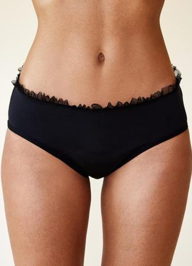 Culotte menstruelle "Colette" noire pour flux léger, moyen ou abondant avec volant en plumetis de Sisters Republic