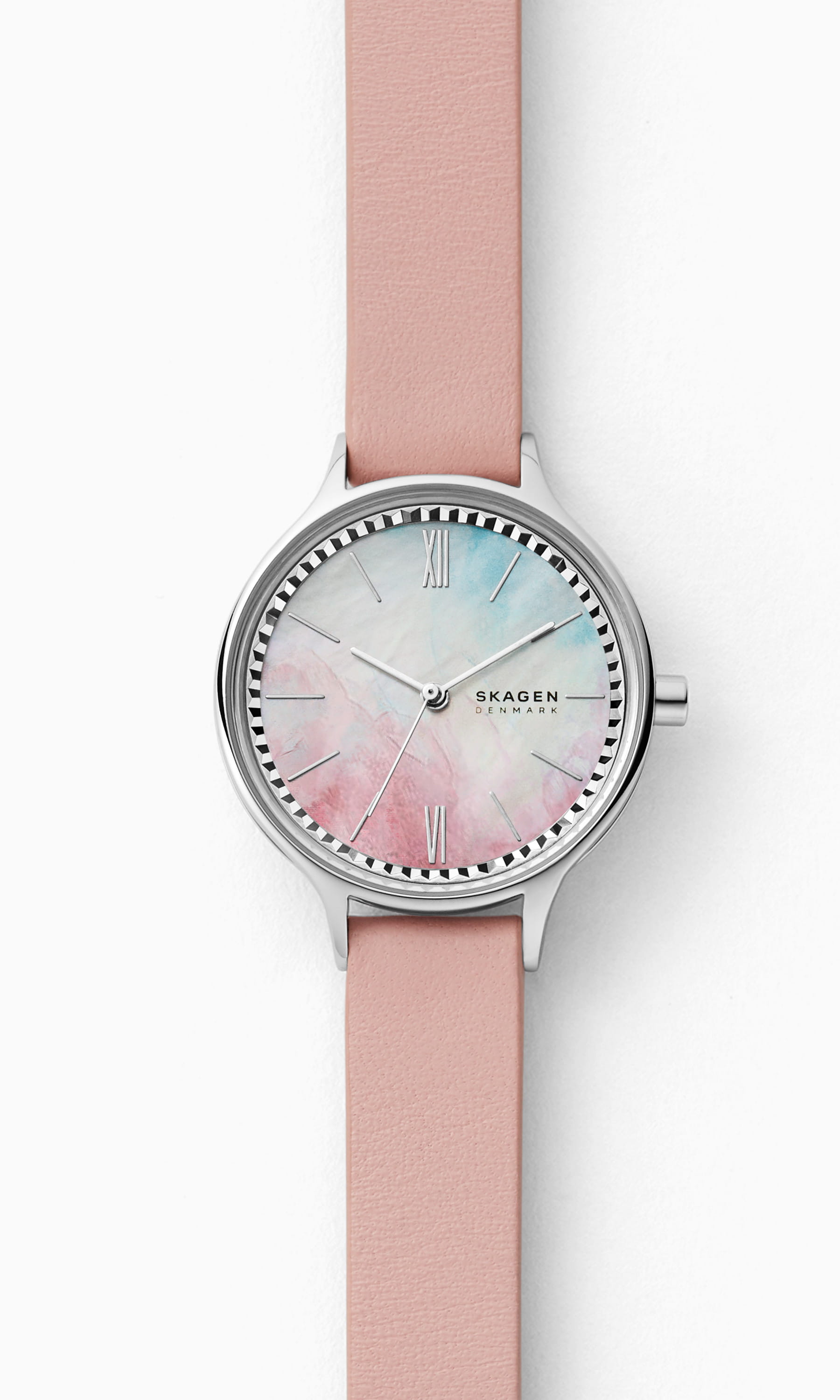 Montre bracelet en cuir rose avec cadran coloré de Skagen