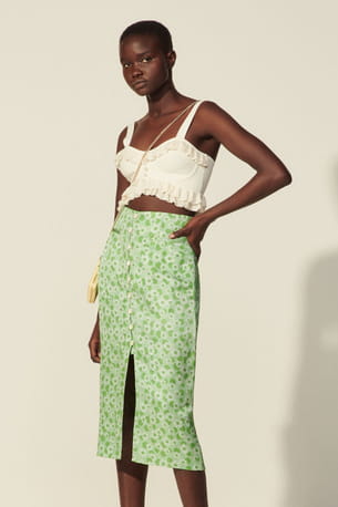 Jupe printemps-été droite à imprimé fendue verte et boutonnée de Sandro