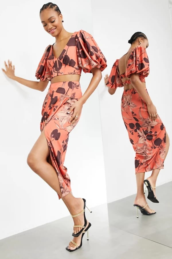 Jupe printemps-été drapée à imprimé orchidées couleur cannelle d'ASOS Edition