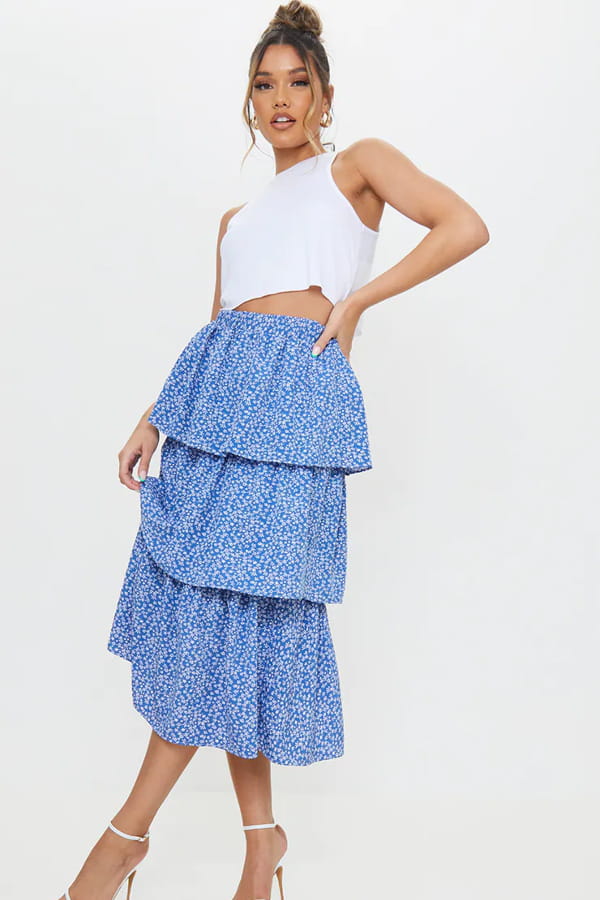 Jupe printemps-été imprimée à fleurs mi-longue à volants bleue de PrettyLittleThing