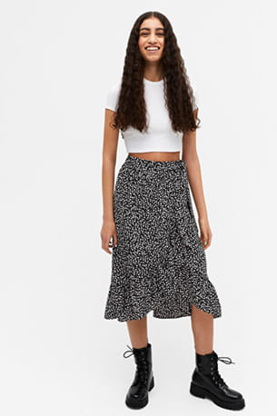 Jupe printemps-été midi wrap à imprimé floral noir et blanc de Monki