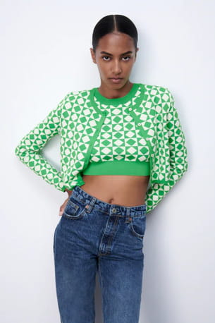 Gilet en maille à losanges à col rond vert et blanc de Zara