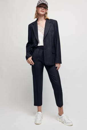 Pantalon en laine et cachemire à rayures bleu marine de Maje
