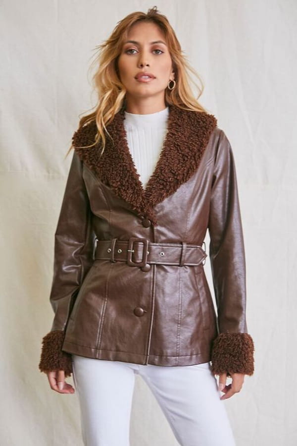 Veste en similicuir et fausse fourrure marron ceinturée de Forever 21
