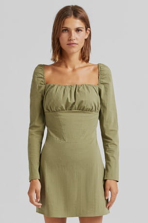 Robe kaki à manches longues et décolleté carré froncé de Bershka